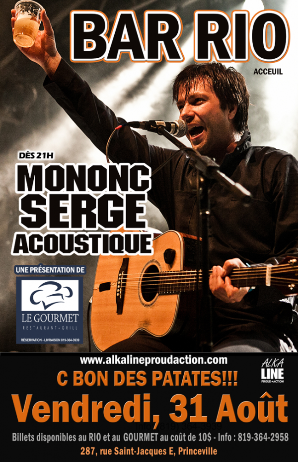 Et oui, c'est vendredi prochain, le 31 août que Mononc Serge sera au Bar Rio à Princeville, soyez en grands nombre. Les billets sont en vente 10$ et sont disponibles au Bar Rio ainsi qu'au Restaurant Le Gourmet.