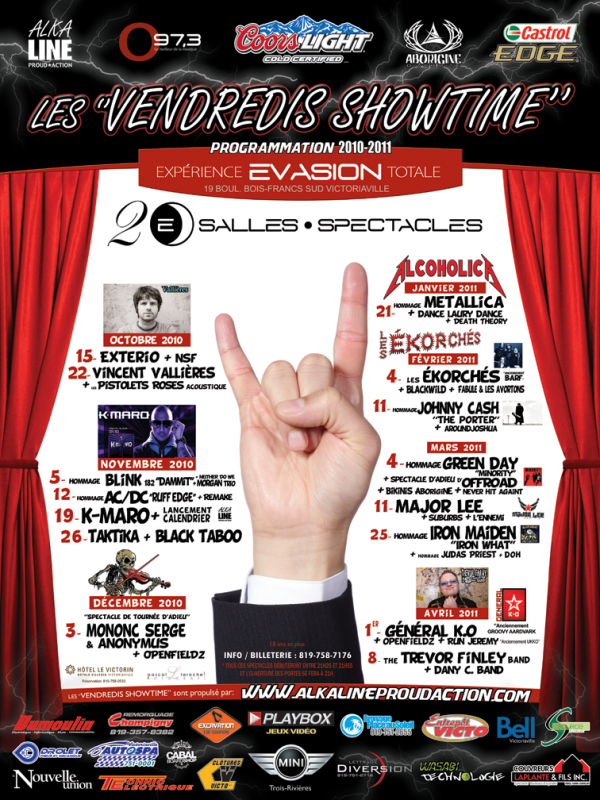 Après plusieurs mois de préparation, Alkaline Proud-Action lance officiellement sa programmation 2010-2011 des MÉGAS SHOWS présentés dans la salle de spectacle au 2e étage de l'Évasion, situé au 19, boul. Bois-Francs Sud à Victoriaville.